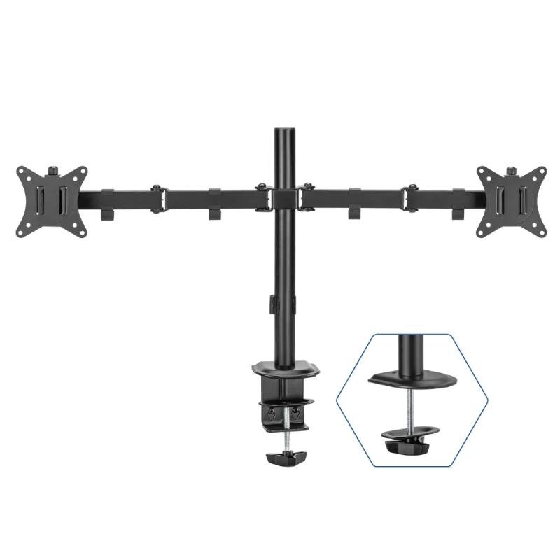Características: – Monitores soportados: 17" – 32" – VESA: 75×75 y 100×100 – Peso máximo soportado: 9 kg por brazo – Ángulos: Inclinación: +45°/-45° Giro: +90°/-90° Rotación: +180°/-180° – Altura: ajustable hasta 407 mm – Extensión máxima de los brazos: 441 mm – Instalación mediante abrazadera o tornillo pasante – Apertura abrazadera: 1 a 8,5 cm – Profundidad tornillo pasante: 1 a 4 cm – Color: negro – Peso neto: 3,45 kg – Peso bruto: 5 kg – Medidas (embalaje): 426 x 107 x 187 mm – Incluye manual, tornillería e instrucciones de instalación – Cumple especificaciones RoHS